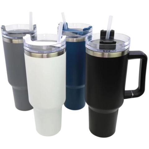 Egyszínű hőtartó bögre tetővel és szívószállal 1200 ml SÖTÉTKÉKA rozsdamentes, duplán sz
