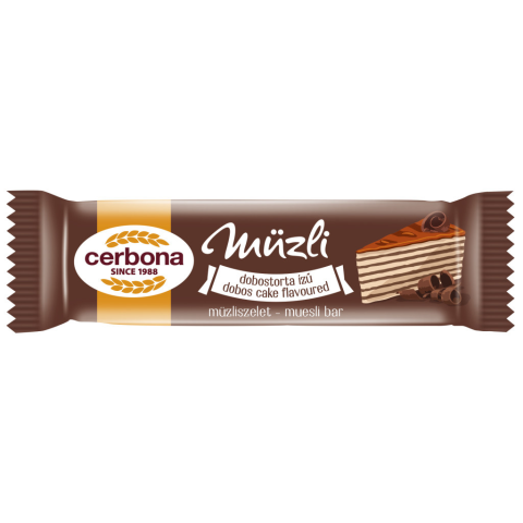Cerbona szelet dobostorta 20 g Összetevők: extrudált gabonapehely 23% (búzadara 53%, rizsliszt 40%, cukor, emulgeálószer: zsírsavak mono- és digliceridjei, étkezési só, zsírszegény kakaópor), kakaós tejbevonómassza 19% [cukor, teljes mértékben hidrogén