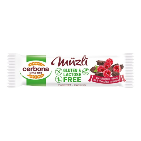 2 kép Cerbona Müzliszelet CERBONA étcsokoládés és málnás gluténmentes 20g