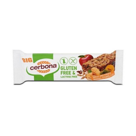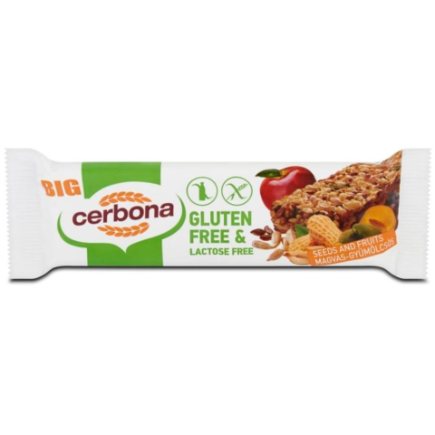 A Cerbona Gluténmentes magvas-gyümölcsös müzliszeletet kukoricából készítjük, mely természetesen gluténmentes. Több mint 30%-ban tartalmaz magvakat, földimogyorót. Szilvát, almát adunk hozzá, s szeletté formázzuk. Termékünk elkészítése során csak laktózmentes alapanyagokat használunk.