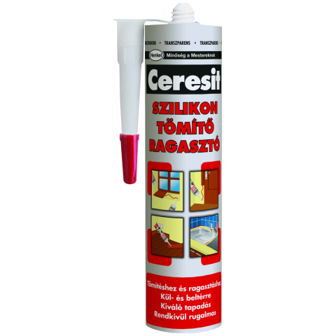 Ceresit szilikon tömítő ragasztó - 300 ml - transzparens - ecetsavas bázisú, tartósan rugalmas, szilikon tömítő- és ragasztóanyag - kül- és beltérre - öregedés- és UV-álló - nem reped, nem zsugorodik, nem színeződik el, ellenáll az igénybevételeknek - nedvesség- és gombásodás-álló, ellenáll enyhe savaknak és lúgoknak