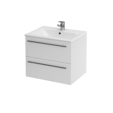 Cersanit Elisa 50 bútor szett. A bútor lapraszerelt. Függesztett kivitelű, kettő fiókkal ellátott bútor. Magasfényű fehér fóliázott 16 mm-es forgácslapból készült. A fiókok csillapított záródású fióksínekkel és nagyméretű krómozott fogantyúkkal vannak ellátva. A szett tartalmazza az 50 cm széles, vékony kivitelű Ontario mosdót. Méret: 51 cm x 50 cm x 40 cm.