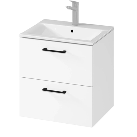 A készlet modern dizájnnal rendelkező függesztett kivitelű termék. A szekrény eleje és teste lakkfestett forgácslapból készült, fényes fehér színű. A szekrény két fiókkal rendelkezik, lágyan záródó rendszerrel és 2 színű fogantyúval: króm és fekete. A felső fiók szifonhellyel el van választva. A szett részét képező kerámiamosdó vékony kivitelű, ami tökéletesen illeszkedik a bútorhoz. A bútor lapraszerelt termékként kerül forgalomba. A frontlapon a f