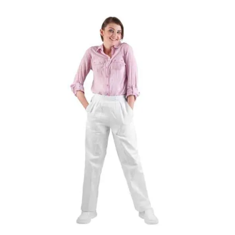 Női munkásnadrág 100% pamut alapanyagból. A nadrágon oldalt 2 zseb található, továbbá oldalt bőségállító gombokkal rendelkezik. Női fehér munkásnadrág 100% pamut alapanyagból. A nadrágon oldalt 2db zseb találhatóA nadrág oldalt bőségállító gombokkal re
