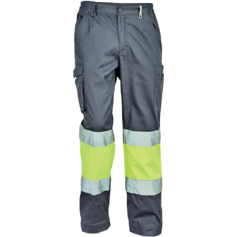 Férfi láthatósági munkásnadrág, a lábszárán dupla sorban 7cm-es fényvisszaverő csíkokkal. Térdén Hi-Vis láthatósági elem található. Külső része jól szellőző, ellenálló anyagú. Férfi láthatósági munkásnadrág, 7 cm széles fényvisszaverő csíkokkal a lábsz