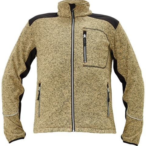 Férfi cipzáros kötött kardigán, melírozott textil anyagból. Fekete színű softshell erősítésekkel a vállakon és kabátujjakon. A pulóver ujján dekoratív fényvisszaverő szegélyek növelik a láthatóságot. Férfi cipzáras dzseki kötött, melírozott textilből,