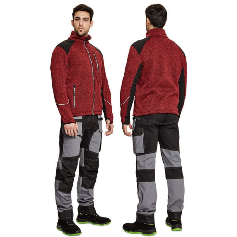 Férfi cipzáros kötött kardigán, melírozott textil anyagból. Fekete színű softshell erősítésekkel a vállakon és kabátujjakon. A pulóver ujján dekoratív fényvisszaverő szegélyek növelik a láthatóságot. Férfi cipzáras dzseki kötött, melírozott textilből,