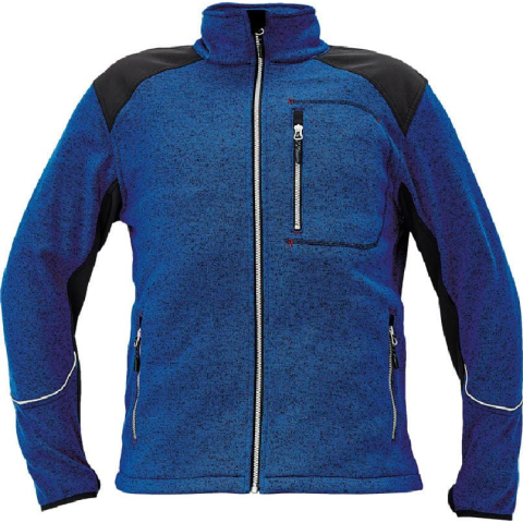 Férfi cipzáros kötött kardigán, melírozott textil anyagból. Fekete színű softshell erősítésekkel a vállakon és kabátujjakon. A pulóver ujján dekoratív fényvisszaverő szegélyek növelik a láthatóságot. Férfi cipzáras dzseki kötött, melírozott textilből,