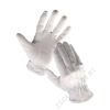 Kötött pamutkelméből varrt, mandzsetta nélküli kesztyű PVC-vel pontozott tenyérrel és ujjakkal, valamint rugalmas szalaggal a csukló felső részén.