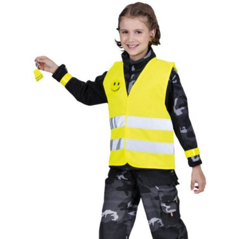 NARDA gyermek szignalizáló sárga h. 140 - Biztonsági csomag: Jólláthatósági mellény, szalag, matrica, kulcstartó. - Biztonsági ruházat, jólláthatósági tulajdonsággal. - 3 év feletti gyermekek számára készült, (120 - 140 cm-es magasságra) utcai ru