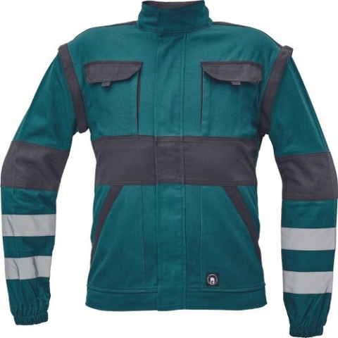 Anyag: Külső felület: 100 % pamut, 260 g/m² Leírás: férfi cipzáras munkakabát levehető újakkal; 2 első zseb, 2 mellzseb; megerősítés a váll és könyök részeken; rugalmas mandzsetta és alsó derékszegély; fényvisszavető csíkok az ujjakon és a kabát hátá
