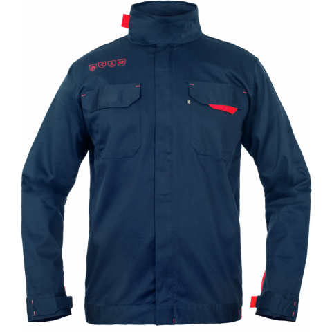 Multinorm munkakabát cipzárral záródó kialakításban tépőzáras hajtókával. Állógalléros kivitel, 2 hajtókás mellzsebbel, szűkíthető mandzsettával.