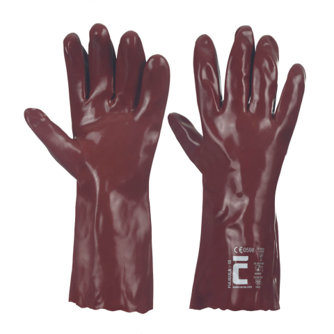 Vegyszer elleni PVC munkakesztyű PVC mártott védőkesztyű kötött pamut kesztyűalapon. Védelmet nyújt mechanikai és vegyi kockázatok ellen. - Hossza: 35cm - Mártás: PVC Vegyi ellenállóképesség: A - Methanol, T - Formaldehyde 37%, P - Hydrogene peroxid 3