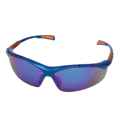 Polikarbonát látómezős munkavédelmi szemüveg: állítható szárhossz, sportos kivitel, karcálló és páramentes látómező, az EN 166 sz. szabvány szerinti F osztály - kis energiájú becsapódás elleni védelem, az 1. optikai osztály, kék látómező az EN 172 sz. sza