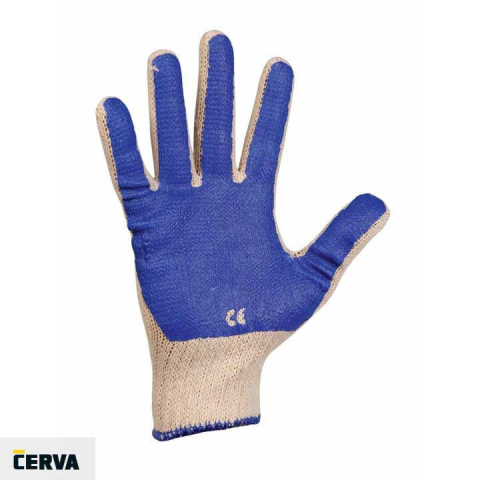 Varratmentes mártott pamut kesztyű Különböző színű kötött, varratmentes pamut kesztyű színes PVC-be félig mártott tenyérrel és ujjakkal, valamint rugalmas mandzsettával. Szabványok:EN 420 Jellemzők: Skála: 7 gg Mandzsetta típusa: knitwrist Mártott te