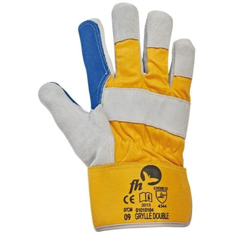 GRYLLE DOUBLE FH védőkesztyű cuff 7 cm- 10 - Kombinált védőkesztyű hasított marhabőrből, - pamut szövettel, - erősítéssel tenyéren, - hüvelyk- és mutató ujjon. - Merev mandzsetta 7 cm.