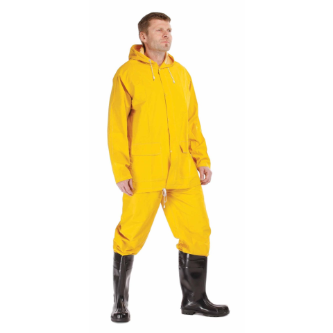 HYDRA esősuit PVC sárga M • kétrészes vízálló öltöny – 3/4-es kapucnis esőkabát és rugalmas derekú nadrág • lehegesztett varratokkal • PVC bevonatú poliészterből • 2 mély zsebfedős oldalzseb • patenttal szűkíthető mandzsetták • szellőzőbetétek a háton
