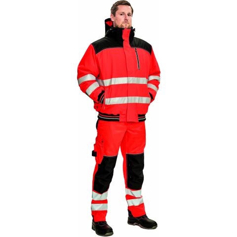 Férfi párnázott jólláthatósági pilótadzseki lecsatolható kapucnival megerősített vállrész cipzáras elütő színű mellzseb 2 oldalzseb zárható belsőzseb a vállrészen és a zsebeken fényvisszavető szegély van dekoratív varrás
