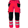 Férfi munkanadrág rugalmas derékkal jólláthatósági kivitelben, 2 oldalsó zseb, 2 repülőzseb, 2 szerszámtartó hurok, 2 oldalzseb a lábon, 1 átlátszó zseb igazolvány számára, D- gyűrű, 2 hátsó zseb, kalapácstartó kontrasztos színben, megerősített térdré