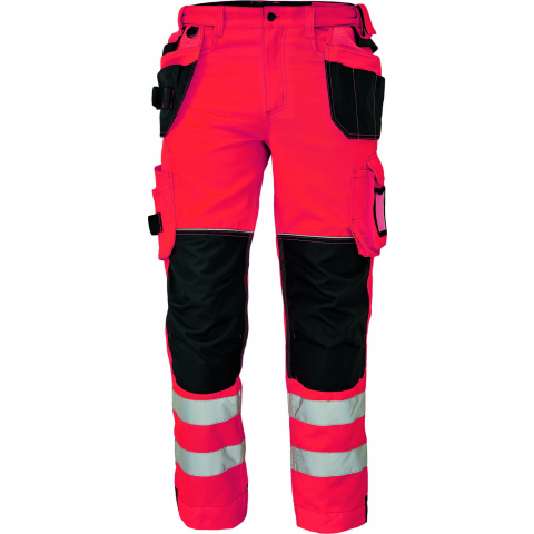 Férfi munkanadrág rugalmas derékkal jólláthatósági kivitelben, 2 oldalsó zseb, 2 repülőzseb, 2 szerszámtartó hurok, 2 oldalzseb a lábon, 1 átlátszó zseb igazolvány számára, D- gyűrű, 2 hátsó zseb, kalapácstartó kontrasztos színben, megerősített térdré