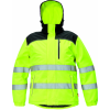Bélelt jólláthatósági férfi télikabát levehető kapucnival, meghosszabbított hát- és vállrésszel, cipzáras, kontrasztos színű mellzsebbel, 2 oldalzsebbel, és 2 zárható belső zsebbel. A kabát alja húzózsinórral állítható, a vállrészen és a zsebeken fény