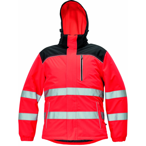 Bélelt jólláthatósági férfi télikabát levehető kapucnival, meghosszabbított hát- és vállrésszel, cipzáras, kontrasztos színű mellzsebbel, 2 oldalzsebbel, és 2 zárható belső zsebbel. A kabát alja húzózsinórral állítható, a vállrészen és a zsebeken fény
