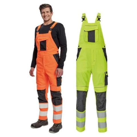MAX VIVO HV férfi HI-VIS mellesnadrág - sárga/narancs férfi HI-VIS munkaruhanadrág rugalmas derékkal; széles nadrágtartók műanyag csatokkal; 2 oldalsó zseb, 1 dupla bal combzseb; 1 nagy mellzseb, 2 hátsó zseb, 2 kis hátsó zseb a jobb combon; két 7,5
