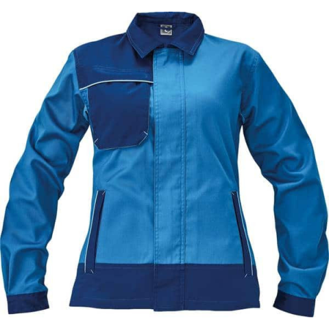Nőies szabással készült, végigcipzáras női munkakabát. Alkalmas meleg munkakörnyezetbe is, köszönhetően könnyű anyagának és lélegző, hálós betétjeinek. Női munka dzseki pamut-PES kevert szálas anyagból Nőies szabással készült Dekoratív díszcsíkozással