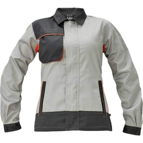 Nőies szabással készült, végigcipzáras női munkakabát. Alkalmas meleg munkakörnyezetbe is, köszönhetően könnyű anyagának és lélegző, hálós betétjeinek. Női munka dzseki pamut-PES kevert szálas anyagból Nőies szabással készült Dekoratív díszcsíkozással