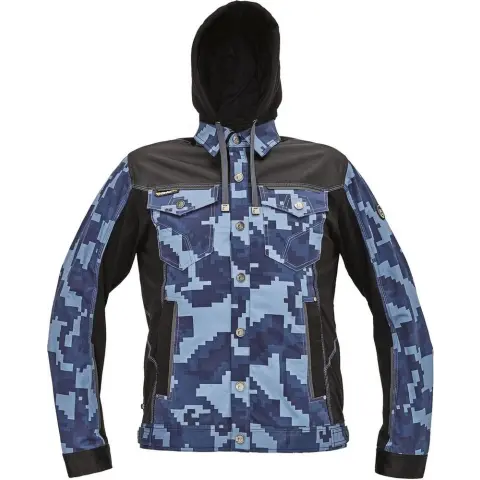 Digitális terepmintás külsővel rendelkező, modern, divatos, rugalmas anyagú kapucnis munkavédelmi kabát. Végig gombos kivitel, szűkített szabással, levehető kapucnival, strapabíró, kopásálló anyagból. Terepmintás, kapucnis munkáskabát elasztikus Trifi