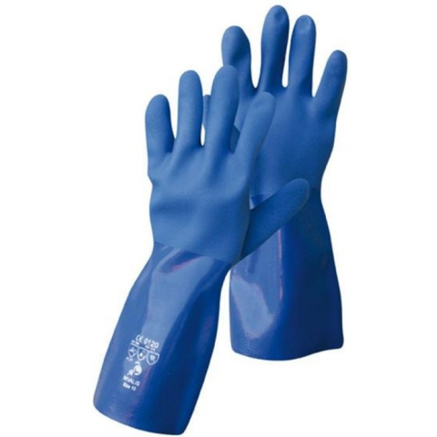 NIVALIS FH védőkesztyű PVC - kék - 10 Vegyszerálló PVC kesztyű, pamut béléssel. Ergonómikus kialakítása miatt könnyen le illetve felvehető, és a speciálisan érdesített felületnek köszönhetően fogásbiztonsága kiváló.