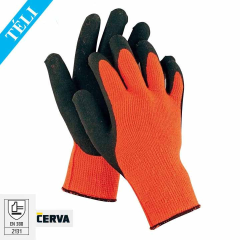 Melegen bélelt mártott védőkesztyű Téliesített kötött nylon védőkesztyű mikropórusos és páraáteresztő latex réteggel tenyéren és ujjakon. Rugalmas kötött mandzsetta. Az alapkesztyű anyaga: nylon A kesztyű mártás anyaga: latex Kiszerelése: 12 pár / csom