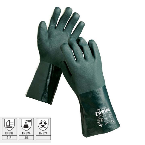 Vegyszerálló kesztyű Kötött pamutkelméből varrt, PVC-be mártott, csúszásgátló kikészítésű vegyszerálló védőkesztyű. A kesztyű teljes hossza: 35 cm. Erős, jó fogásbiztonságú, vegyszerálló, mártott védőkesztyű Minimális rendelési mennyiség 1 pár. A gyár
