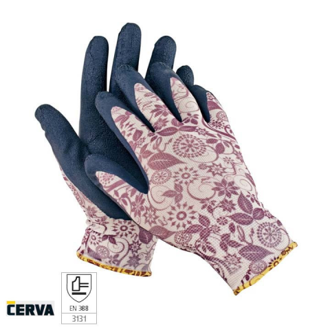 Kézre simuló, női mártott kertészkesztyű Kötött nylon védőkesztyű rugalmas mandzsettával, habosított latexbe mártva. Alapanyag: rugalmas nylon anyagból készült kesztyű habosított latexbe mártva. A termék megfelel a EN 388, EN 21420 szabványoknak.