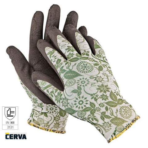 Kézre simuló, női mártott kertészkesztyű Kötött nylon védőkesztyű rugalmas mandzsettával, habosított latexbe mártva. Alapanyag: rugalmas nylon anyagból készült kesztyű habosított latexbe mártva. A termék megfelel a EN 388, EN 21420 szabványoknak.