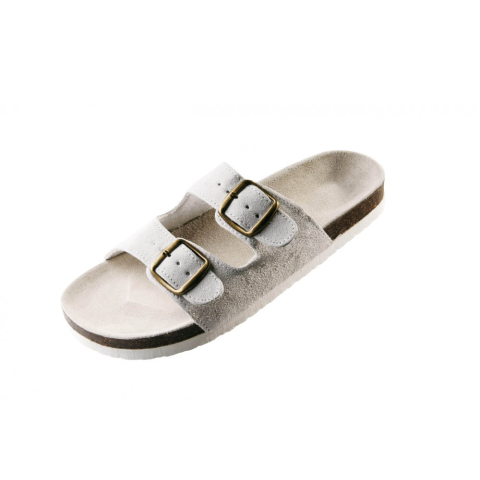 Habgumi talppal rendelkező, parafa papucs, dupla csatos bőr felsőrésszel Parafa papucs Felsőrésze bőrből készült Fém csatokkal rendelkezik Habgumi talppal Dupla csatos kivitel
