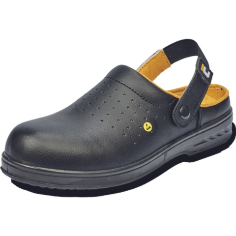 ESD munka klumpa sarokpánttal. Felsőrésze szintetikus, lélegző műbőrből. Üzemanyagálló PU talp, energiaelnyelő sarok.