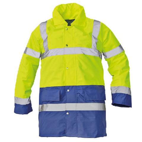 Bélelt és vízhatlan jólláthatósági dzseki az EN 471 szabványnak megfelelő láthatósággal, páraáteresztő PU réteggel, gallérba rejtett kapucnival, az EN 343 szabvány szerinti 3. osztályú vízállósággal és az EN 343 szabvány szerinti 1. osztályú páraátere