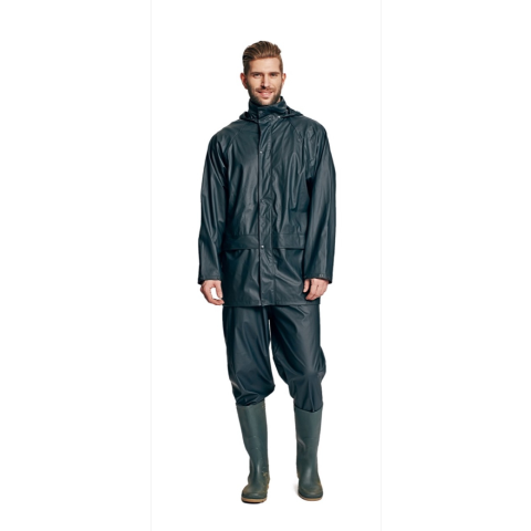 SIRET PU esőöltöny navy XXL • víz- és szélálló esőöltöny • esőkabát gallérba hajtott kapucnival és rugalmas derekú nadrággal • puha poliészter szövet • 2 mély zsebfedős oldalzseb • patenttal szűkíthető mandzsetták