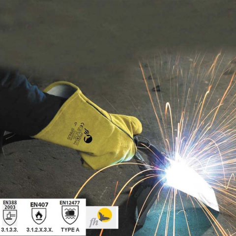 SPINUS Kevlár hegesztőkesztyű Alapanyag: Marhabőr, pamut, kevlár cérna Ez a kevlár cérnával vart hegesztő kesztyű megfelel az EN 420, EN 388, EN 12477 , EN 407 szabványoknak. Sárga hasított marhabőrből készült, pamut bélésű. A 35 cm hosszú hegeszt
