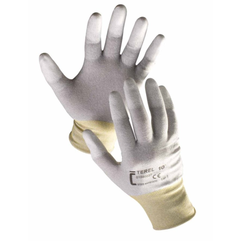 TEREL nylon PU antisztatikus kesztyű 7 • kötött, varratmentes, antisztatikus, nylon kesztyű integrált szénszállal, ujjhegyen PU mártással, rugalmas mandzsettával