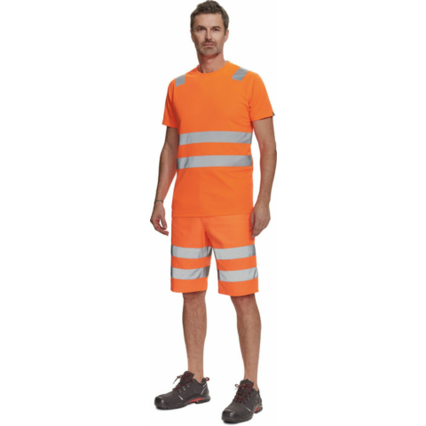 Jól láthatósági póló Hi-Vis póló 5 cm vastag fényvisszaverő csíkokkal. Élénk színe és a fényvisszaverő szalagjai, magas fokú láthatóságot biztosít gyenge és rossz látási viszonyok során is. Poliészter anyagának köszönhetően a munkavédelmi póló kiváló sze
