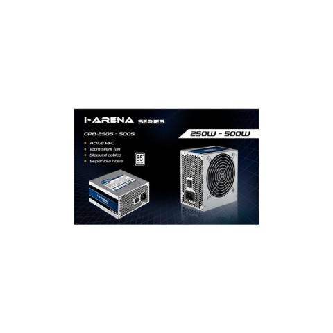 Model IARENA 500W Article no. GPB-500S EAN code 4710713233645 Weight (without/with package) 1.25kg / 1.37kg AC Input 200-240V / 4.0A Frequency 47-63 Hz +5V 17A +3,3V 18A +5V & +3,3V combined 110W +12V1 38A +12V2 - +12V1, +12V2 combined 456W P.F. >0