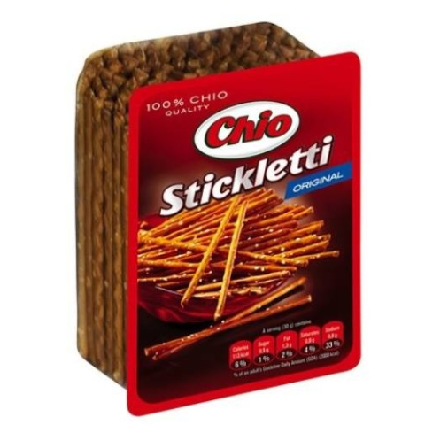 Sóspálcika CHIO 100g. Összetevők: Búzaliszt; Étkezési só (4%); Pálmaolaj; Fényező anyag (nátrium-hidroxid); Búzamaláta liszt; Emulgeálószer (zsírsavak mono- és digliceridjei). Allergének: Tej és abból készült termékek. Szójabab és belőle készült termékek.