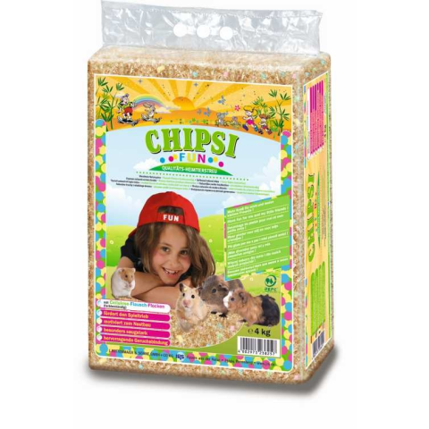 Fun (4kg) A Chipsi Fun puha, kényelmes, szórakoztató alom, kisállatok részére természetes puhafa forgácsból, színtartó, bolyhos cellulózpelyhekkel, ami igazán sokszínűvé varázsolja a kisállatok életét. Ideális játéknak és fészeképítésre is ösztönzi a kisállatokat. A Chipsi Fun alom nagy nedvszívó és kiváló szagmegkötő képességgel rendelkezik, így biztosítja a higiénikus környezetet, emellett pormentes és biológiailag lebomló. Környezetbarát és