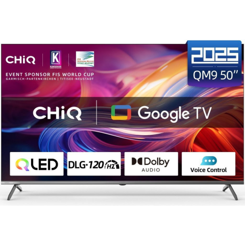 Televízió – Google TV, QLED, 127 cm-es képátló, 4K Ultra HD, 50/60 Hz, HDR10, matt kijelző, 4× HDMI, 2× USB, CI+, LAN, Chromecast, HbbTV 2.0, gamer mód, hangvezérlés, Google Assistant, párosítás mobileszközzel, Oneplay, VESA 400×200, 20 W hangszóró, Dolby Audio, G energiaosztály Keret nélküli QLED Google TV 4K felbontással, Dolby Audio és továbbfejlesztett dbx-tv hangzássalÉlvezd a különféle tartalmak megtekintését a 127 cm képátlójú QLED CHiQ U50QM9V Ultra H