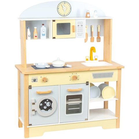 Játékkonyha - anyaga fa és műanyag, méretek 95 × 79 × 29,5 cm (Ma×Sz×Mé), kék, sárga és barna kivitel, forgatható gombok és nyitható ajtó, mosogató, mikrohullámú sütő, mosógép és sütő a csomag része GyermekkonyhaA gyerekkonyha minden játékot kreativitással és szórakozással teli kulináris kalanddá varázsol. A konyha kiváló minőségű és biztonságos anyagokból készült, amelyek garantálják a termék ho