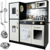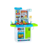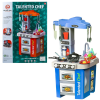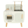 FA KONYHA GYEREKEKNEK 3 év feletti gyermekeknek Fa, stabil szerkezet Sütő, mosogató, mosógép, égők, mikrohullámú sütő, páraelszívó Kattanos hangot adó gombok LED háttérvilágítás Páraelszívó és mikrohullámú sütő működésének hangjai Nyitható szekrén