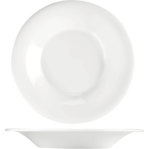 Fehér, mély Churchill Mediterranean tányér 0,8 l űrtartalommal és 256 mm átmérővel. Porcelánból készült. Minden konyhába és étkezőbe alkalmas.