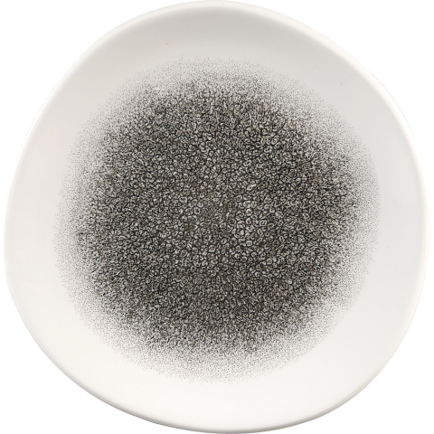 CHURCHILL Raku Quartz sekély porcelántányér fekete kvarcszínben, organikus formával. A tányér átmérője 286 mm. Ideális főételek tálalásához vagy dekorációs elemként.